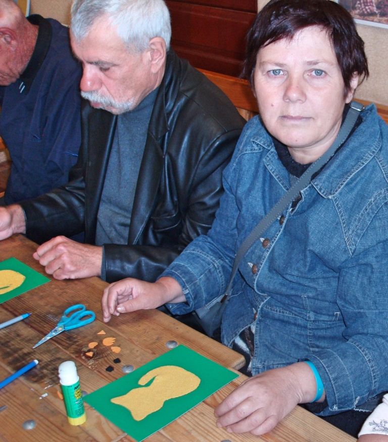 Тепла атмосфера й осінні ностальгічні нотки огорнули гостей нашого заходу. Хотілося дарувати настрій, усмішки, добрі слова. Після короткої презентації та живої, щирої розмови кожен відчув натхнення створити щось особисте — аплікацію для друга чи знайомого, щоб нагадати про себе й подарувати краплину радості. Так народився м’якенький жовтий котик із фетру на зеленому фоні — символ тепла, осінніх барв і людяності. Він ніби запитує: «Ти як? Посміхнися. Обіймімося?» І вже наповнений сяйвом в очах Яскін Дмитро дарує свою роботу сусідці поруч, адже так приємно стати початком ланцюжка приємних моментів.